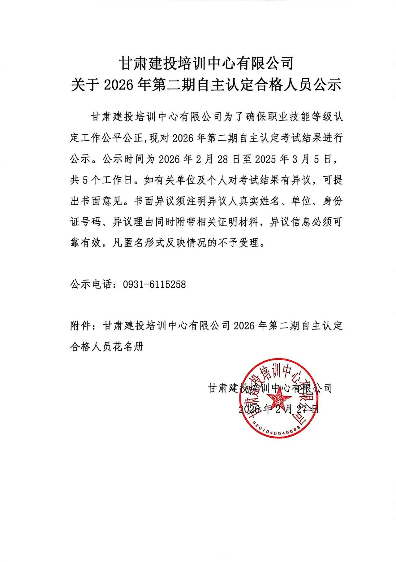 甘肃建投培训中心有限公司关于2026年第二期自主认定合格人员公示