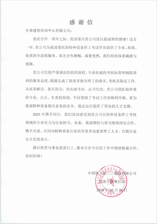 甘肃建投培训中心收到中国核工业二三建设有限公司甘肃片区项目部发来的感谢信