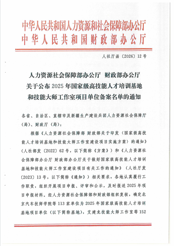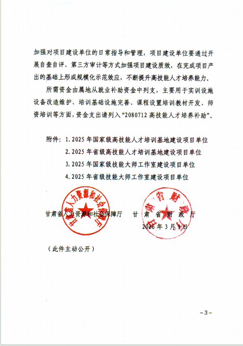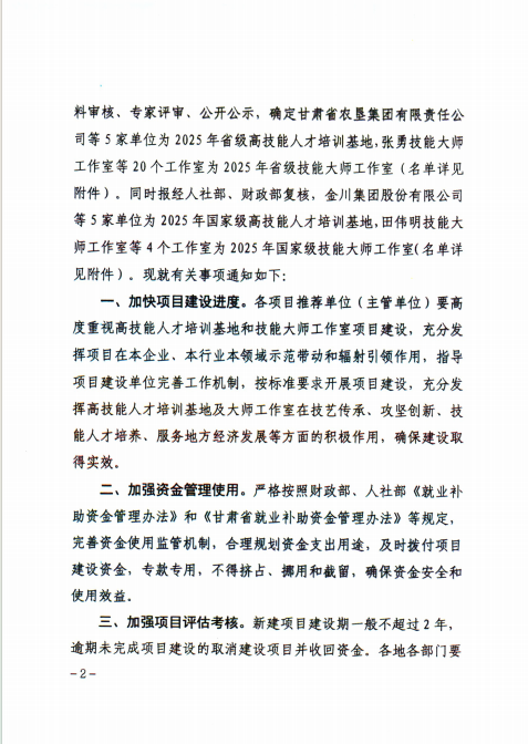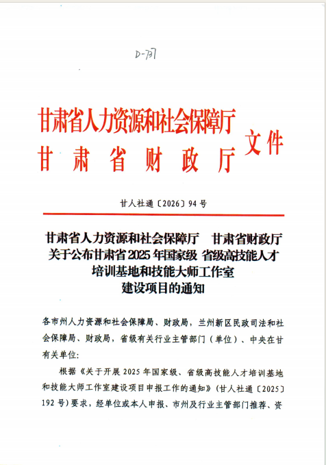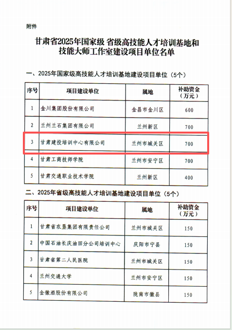 近日,人力资源社会保障部办公厅、财政部办公厅联合印发《关于公布2025年国家级高技能人才培训基地和技能大师工作室项目单位备案名单的通知》,甘肃省人力资源和社会保障厅、省财政厅同步发布相关文件,正式公布2025年高技能人才培训基地建设项目名单。甘肃建投培训中心有限公司凭借雄厚的办学实力与显著的培训成效,成功入选2025年国家级高技能人才培训基地,并获得项目建设专项补助资金,正式迈入国家级技能人才培养平台行列。
