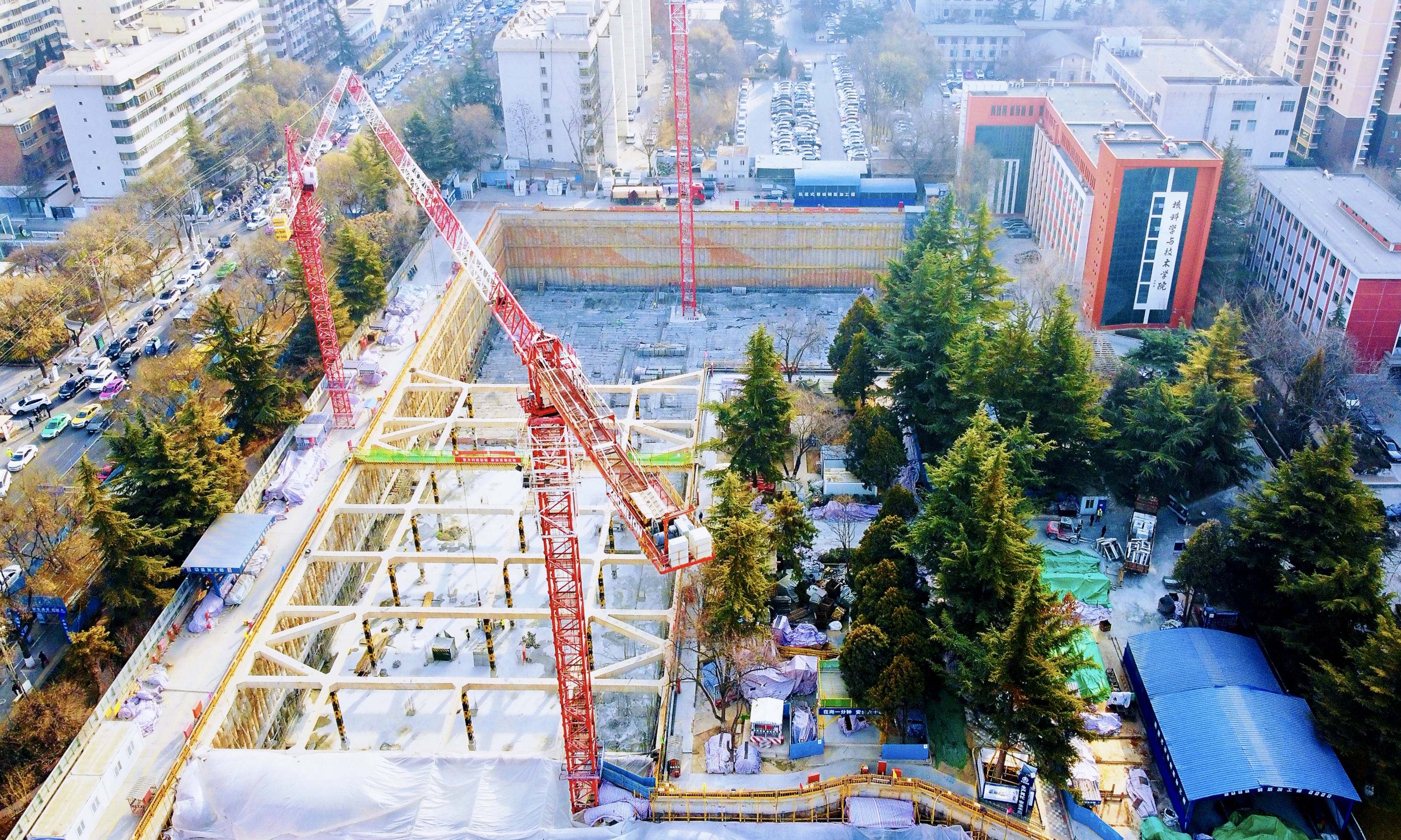 “即将进入冬季暂停施工,为了保证复工复产的顺利进行,我们已将材料提前进场,并对专业分包单位和劳务班组召开了复工动员大会。确保在正月初八复工以后能够第一时间投入生产。”项目负责人胡亮现场介绍,截至目前,项目西塔已完成负2层结构施工,东塔完成筏板浇筑,学术中心完成负3层结构及内支撑拆除,基础施工稳步推进。新的一年,项目部将紧盯主体封顶、分段验收、工序穿插等关键节点,以周保月、以月保季,用刚性管理兑现承诺,全力以赴将项目打造为质量过硬、群众满意的精品工程,不负学校与社会各界的殷切期望。