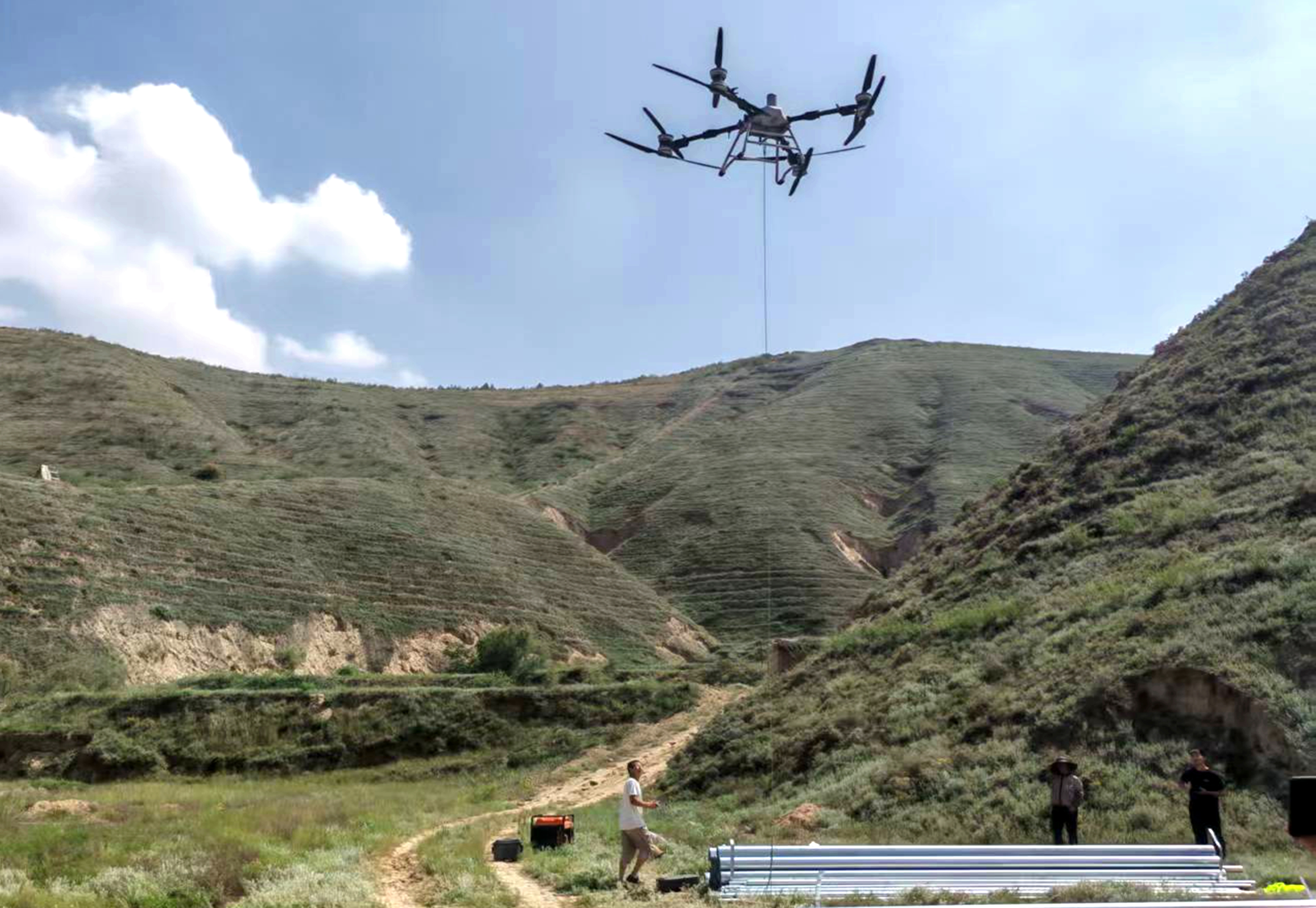 立足西北干旱少雨、土壤贫瘠的地域特点,项目团队严格遵循“适地适树”原则,提前谋划苗木储备、科学制定种植方案,优选侧柏、山桃、山杏、柠条等耐旱、耐贫瘠、适应性强的乡土树种,为春季大规模栽植做好充足准备。针对山地坡陡沟深、常规机械难以进场的作业难题,创新引入植保无人机技术,实现精准播种、高效作业,让科技成为山地绿化的“新引擎”,大幅提升造林效率与成活率。