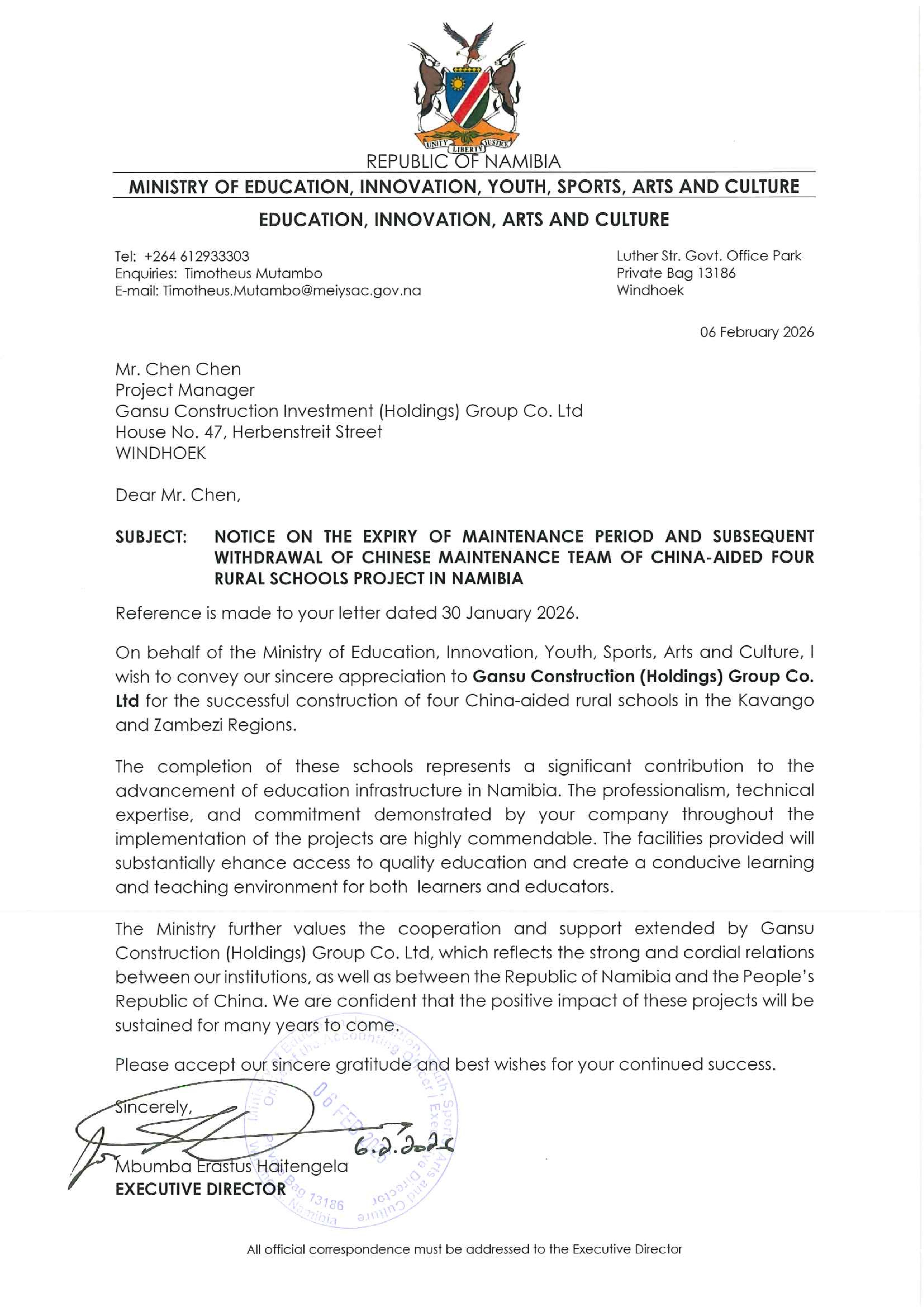近期,甘肃建投收到纳米比亚教育、创新、青年、体育、艺术与文化和旅游部发来的感谢信。信中对甘肃建投高标准、高质量完成西卡万戈省和赞比西省4所中国援助乡村学校建设工程表示诚挚谢意,对项目为当地教育基础设施发展所作出的重要贡献给予高度评价。