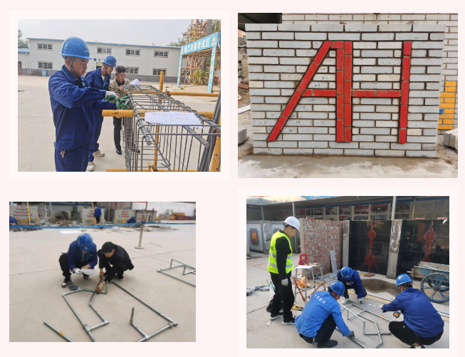 培训现场气氛热烈,专业的指导老师倾囊相授。砌筑工选手专注地学习着每一块砖石的摆放技巧,力求做到墙面平整、灰缝均匀,他们手中的瓦刀上下翻飞,仿佛在演奏着一曲建设之歌。管工选手全神贯注地研究着管道的连接与布局,精确测量、熟练操作,确保每一个接口都牢固可靠。钢筋工选手一丝不苟地绑扎着钢筋,熟练地进行实践操作。参赛选手之间相互交流、相互学习、共同进步,他们以饱满热情和严谨的态度投入到实际操作中。